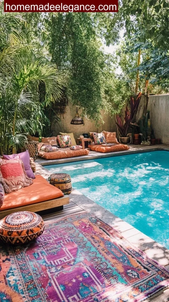 12. Bohemian Chic Pool Deck with Colorful Rugs and Pillows
