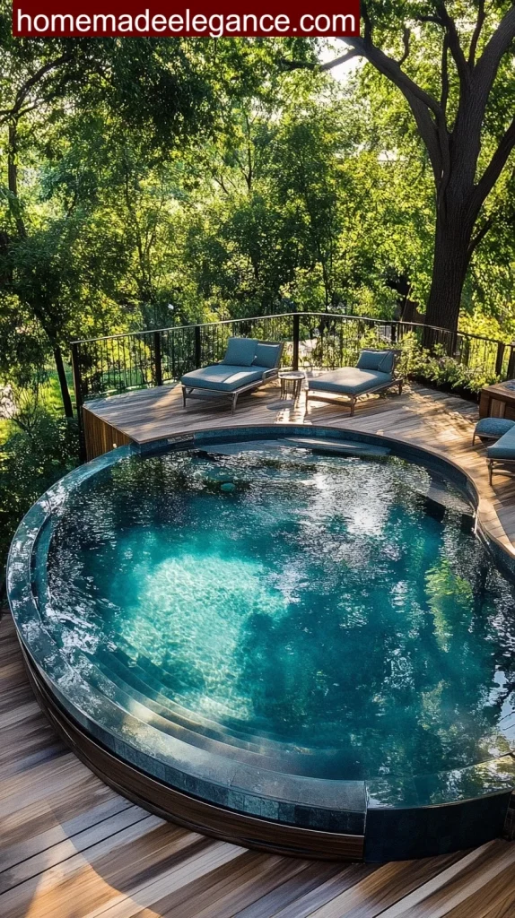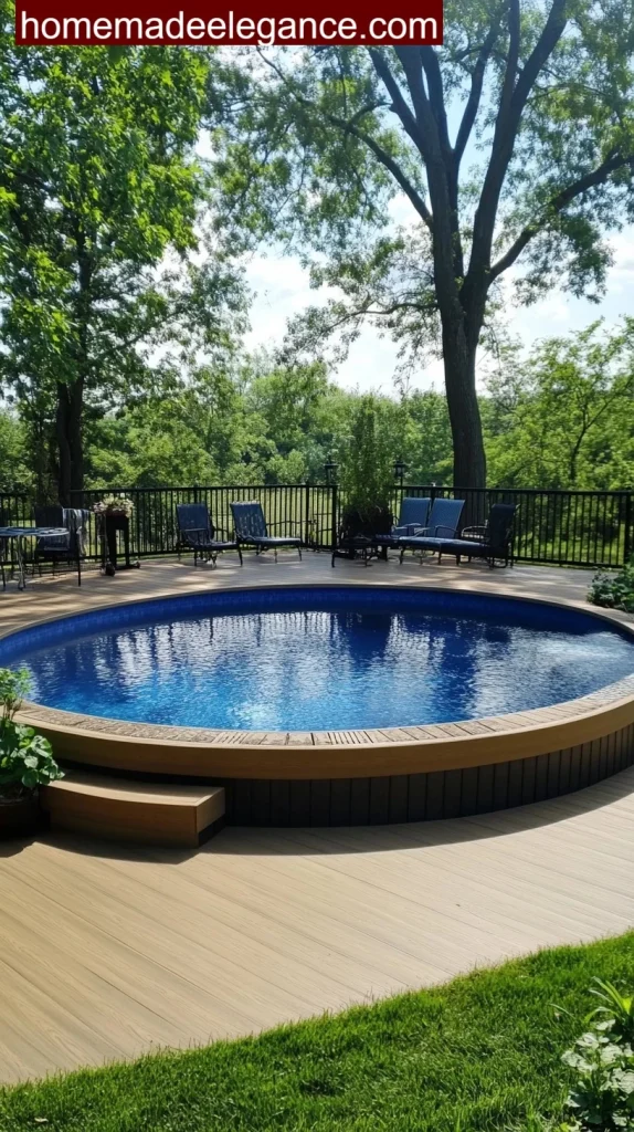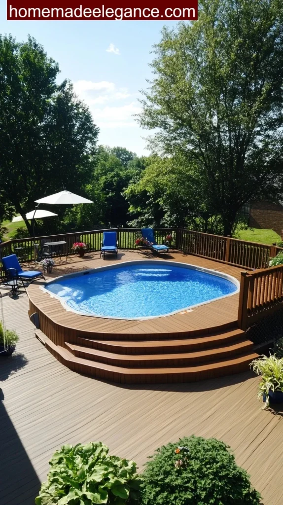If your pool is on the smaller side, consider a circular deck design that works well in compact spaces. This shape not only makes the most of limited space but also adds a unique and inviting vibe to your backyard. Perfect for smaller urban areas or modestly sized gardens.