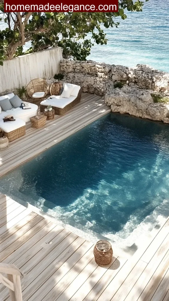 Create an inviting space for relaxation by designing a pool deck with built-in seating areas and cushions. Choose weather-resistant fabrics and soft pillows for comfort, and pair with low-profile wooden or composite furniture to give your deck a cozy, lounge-like vibe perfect for summer afternoons.
