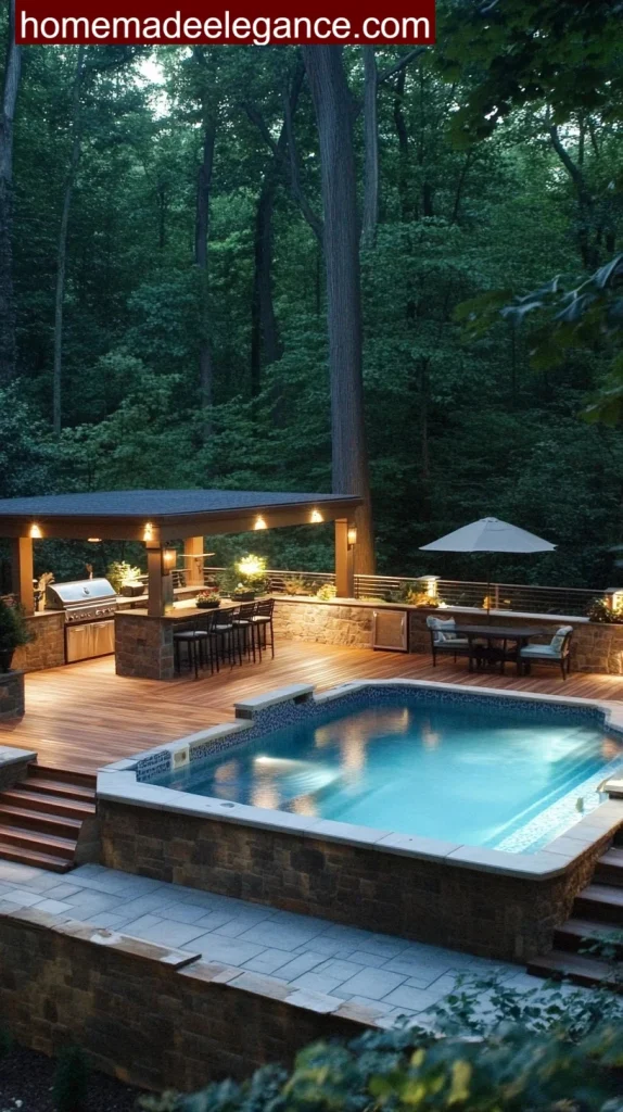 Maximize the use of your pool deck by incorporating a built-in BBQ area. This feature makes it perfect for entertaining friends and family by the pool. With a little DIY effort, you can create an outdoor kitchen complete with a grill, counter space, and storage—all without spending a fortune.