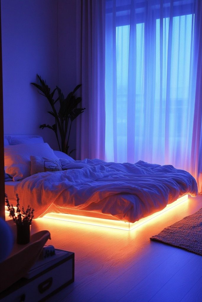 Enhance your bedroom’s aesthetics with under-bed LED lights that create an illusion of a floating bed. Use motion-sensor LEDs for an automatic glow when stepping out of bed at night.