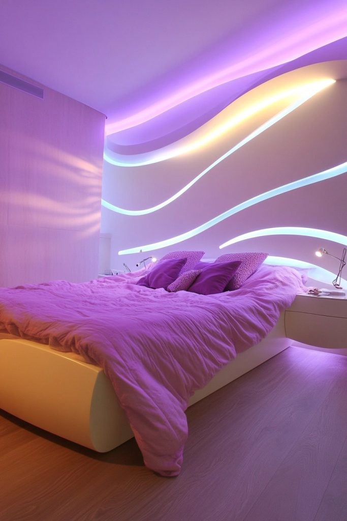 RGB LED wall panels bring a futuristic vibe to your bedroom. These panels come in various shapes and allow you to customize colors and patterns for a unique, high-tech experience.