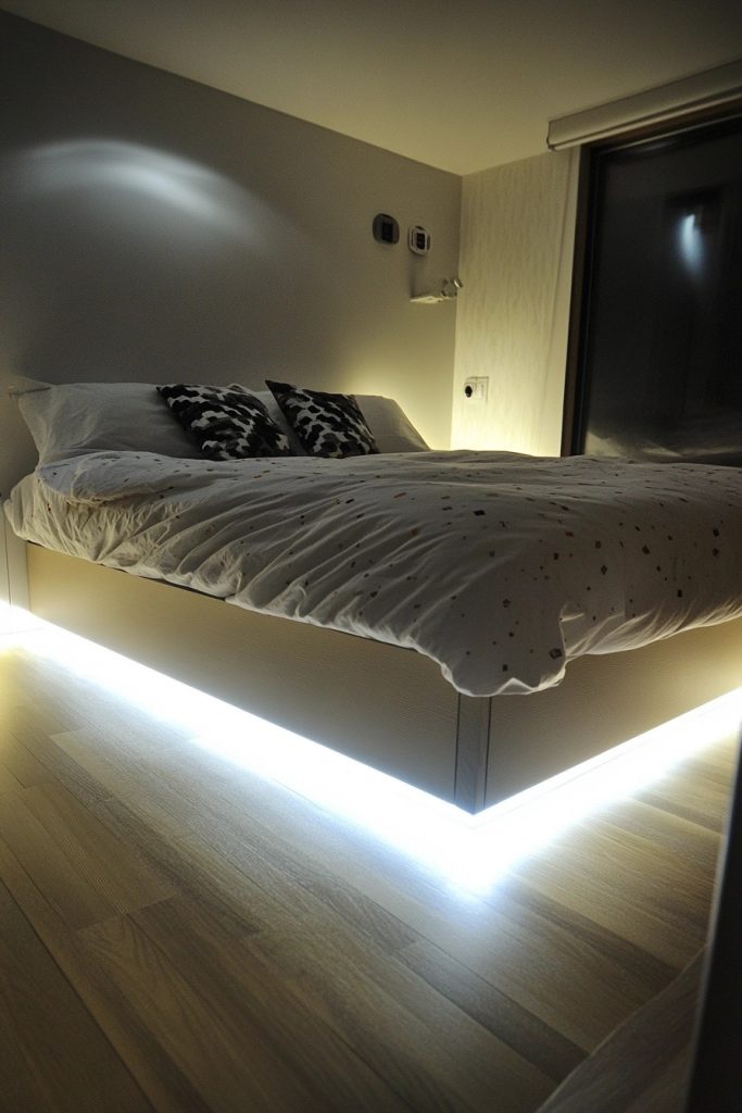 Adding warm white LED lights under your bed frame creates a cozy, inviting glow. This subtle lighting option is perfect for a relaxing atmosphere, making your bedroom a tranquil retreat after a long day.