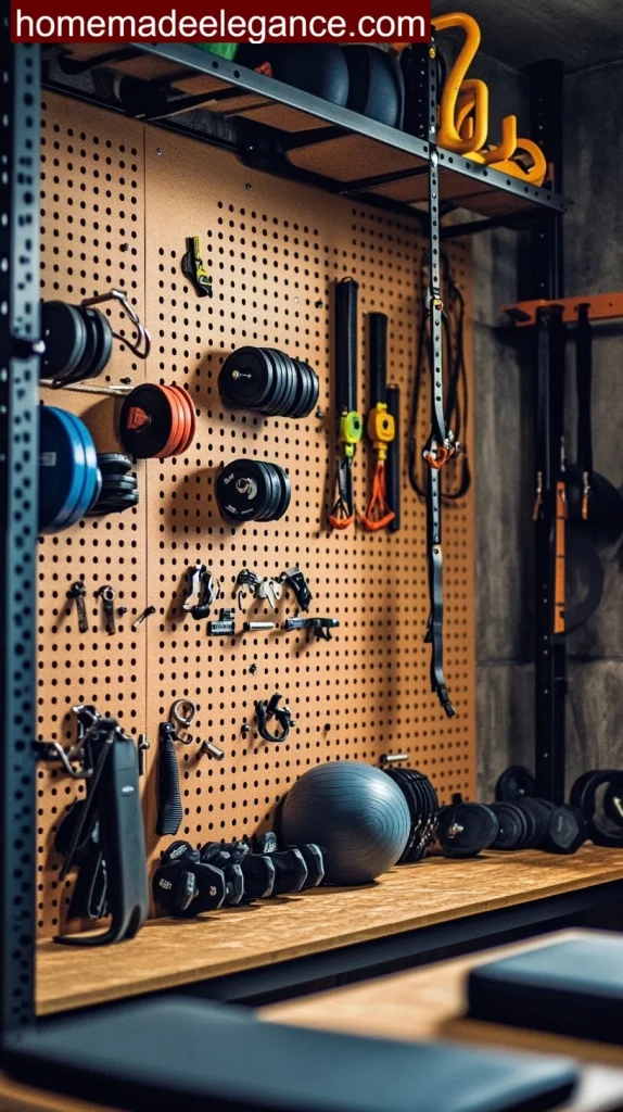 Pegboards are a fantastic organizational tool for small garage gyms. Use them to hang smaller items like jump ropes, resistance bands, yoga mats, and weights. This will free up floor space and help you keep everything neatly stored.