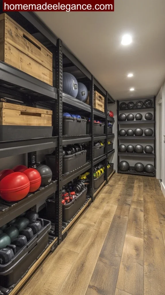 Hanging storage solutions are perfect for storing medicine balls, kettlebells, and other small equipment. You can use hooks, racks, or shelves mounted on the wall or ceiling to keep your gear off the floor and organized.