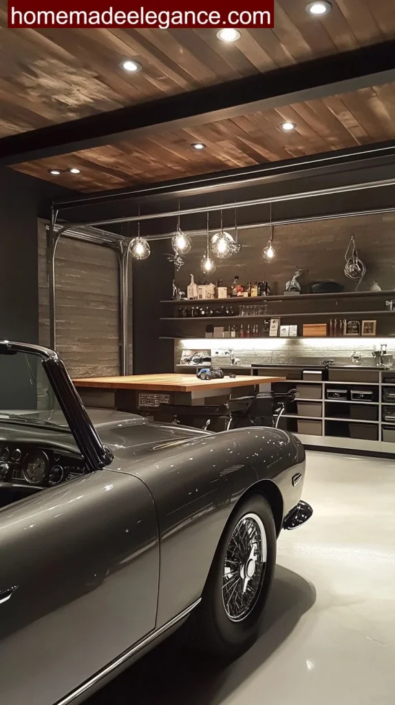 Upgrade your garage with luxury custom shelving and sophisticated lighting. Opt for built-in cabinetry, high-end finishes, and accent lighting to create a stylish, functional space. A statement chandelier or pendant lights can add a touch of elegance.