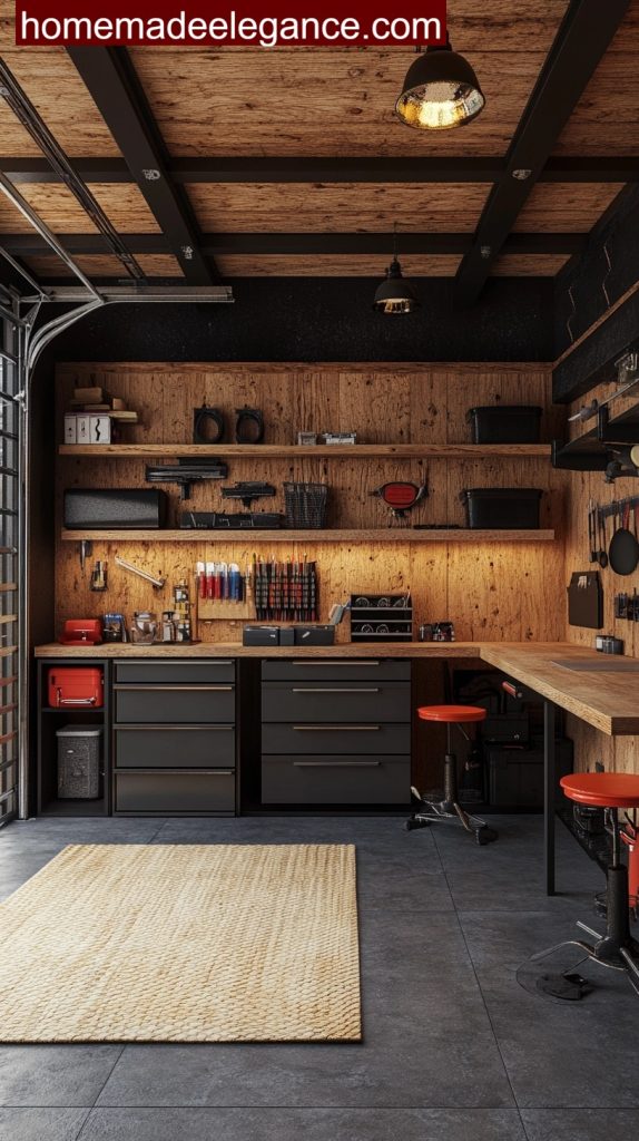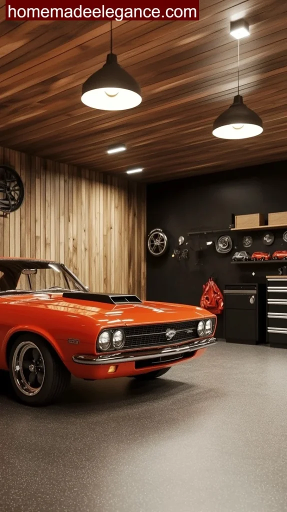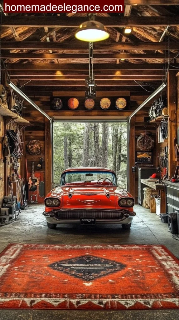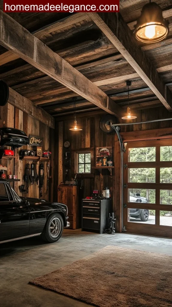 For a warm, welcoming vibe, embrace rustic charm with wooden accents. Incorporate reclaimed wood on your walls, ceiling beams, or storage shelves to add character to your garage. Pair it with vintage lighting fixtures and cozy furniture for a cabin-like retreat.